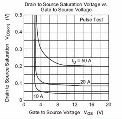 下圖是瑞薩2SK3418的Vgs電壓和Vds電壓的關系圖。可以看出小電流時,Vgs達到4V,DS間壓降已經很小,可以認為導通。