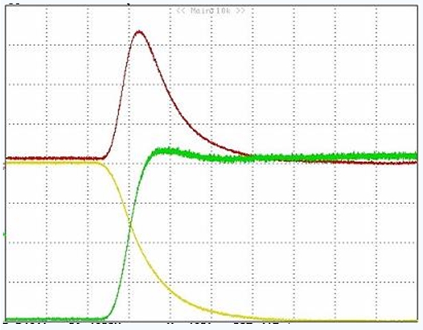 下圖是MOS管導通時的波形。可以看出,導通瞬間電壓和電流的乘積很大,造成的損失也就很大。降低開關時間,可以減小每次導通時的損失;降低開關頻率,可以減小單位時間內的開關次數。這兩種辦法都可以減小開關損失。