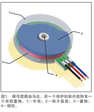 多數(shù)振動馬達(dá)由一個較小的電動馬達(dá)驅(qū)動一個偏心配重,如圖1所示。馬達(dá)分為直流有刷或無刷電機,有兩種基本的結(jié)構(gòu):硬幣狀(扁平)與圓柱形(條狀)。