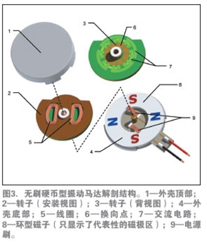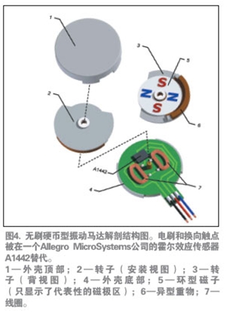 如前所述,無刷電機具有較長的壽命,并由于產(chǎn)生的電火花較少,也沒有了RFI干擾。無刷直流(BLDC)設(shè)計還提供業(yè)內(nèi)直徑最小、厚度最薄的扁平振動馬達(dá)。圖4介紹了這種馬達(dá)的基本構(gòu)造。