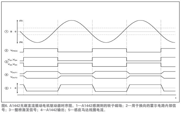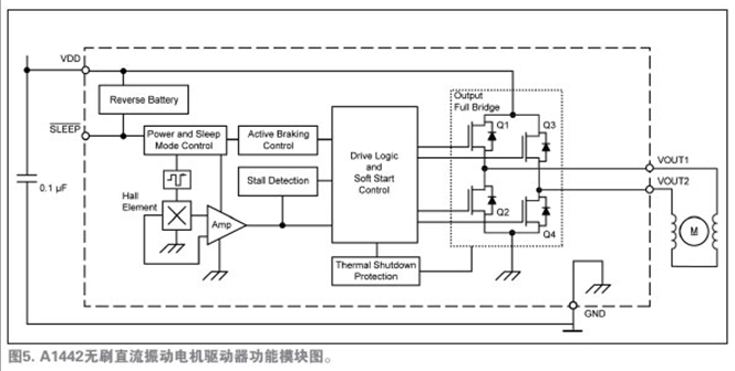 A1442是驅(qū)動馬達(dá)唯一必須的的IC。圖5所示的功能模塊圖說明了設(shè)備運行和先進(jìn)的特性。注意圖4和圖5中,采用集成的霍爾傳感器免除了外部霍爾傳感器,從而減少了馬達(dá)PCB元件數(shù)量。唯一所需的外部元件是一種標(biāo)準(zhǔn)電路特性——位于應(yīng)用馬達(dá)安裝PCB上的0.1µF的旁路電容,它用于降低在開關(guān)電源的電感負(fù)載時產(chǎn)生的瞬時電壓峰值。
