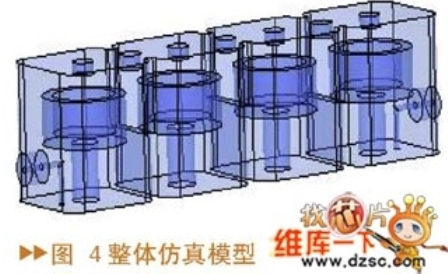 通過與前面計(jì)算的耦合系數(shù)理論值的比較,可以選擇合適的耦合孔及耦合螺釘?shù)某跏贾到⒄w仿真模型(圖4)。一般這種初始值進(jìn)行整體仿真的結(jié)果與期望的濾波器指標(biāo)有一定的偏差,通過調(diào)節(jié)耦合螺釘?shù)纳疃取⒓?lì)的位置以及頻率調(diào)諧螺釘?shù)纳疃瓤墒篂V波器達(dá)到期望的指標(biāo)。