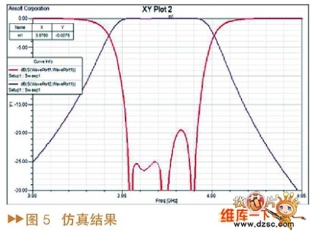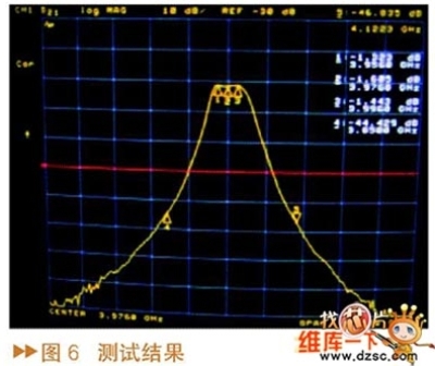 通過優(yōu)化得到濾波器的仿真結(jié)果如圖5所示,在仿真過程中為了提高仿真速度,全部的材料都設(shè)置成理想材料,所以仿真結(jié)果中濾波器插損為零。實(shí)際測(cè)試的濾波器的波形如圖6所示,可以看出,該方法設(shè)計(jì)的濾波器實(shí)際測(cè)試的結(jié)果與仿真的結(jié)果非常吻合,能夠達(dá)到指標(biāo)要求。