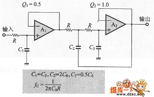 圖4的構(gòu)成與1次和2次電路級聯(lián)的方法相比較,電路簡單化。而且也能用同一常數(shù)構(gòu)成。另外,OP放大器A,上具有增益,通過A1,的正反饋(省略A2),使OP放大器的個數(shù)減少了1個。注意這里需要通頻帶的增益為1.82倍。