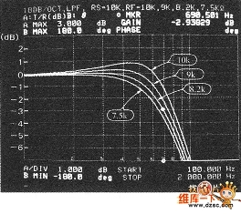 而現(xiàn)在還不清楚在電路中用于最平坦特性的正反饋量的計算步驟,所以可用實驗來求得。圖3是C=0.01μF、RF=16kΩ(通常fc=1kHz),反饋電阻RF在7.5k~10kΩ變化時的頻率特性。標識點為8.2kΩ的曲線被認為是最平坦的反饋電阻值。