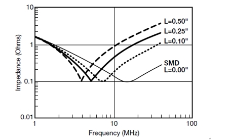 引腳所產生的電感對阻抗的影響如圖6所示。一個很好的經驗算法是,電路板上每0.10"的引腳長度將產生2.5nH的電感。就像低電感電容器將頻率向高處偏移一樣,引腳器件將頻率往低端偏移。要實現最佳的EMI濾波,必須牢記這一點。
