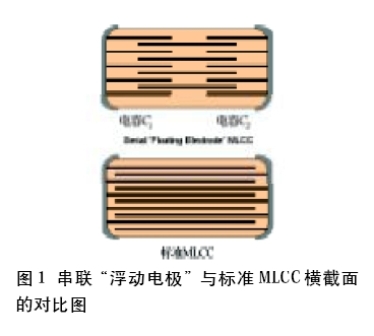 許多年前,人們發(fā)現(xiàn)在空氣中測試500VDC以上的電壓時,MLCC標(biāo)準(zhǔn)設(shè)計的性能出現(xiàn)了問題。有效層(active layer)之間的內(nèi)部擊穿和接線端之間的表面弧導(dǎo)致了故障的出現(xiàn)。為了解決電容器的有效區(qū)(active area)的電壓應(yīng)力問題,制造商開發(fā)出了一種串聯(lián)“浮動電極”設(shè)計,在單個元件內(nèi)有效集成了2個以上的電容器組。圖1是這類設(shè)計與標(biāo)準(zhǔn)MLCC的比較。