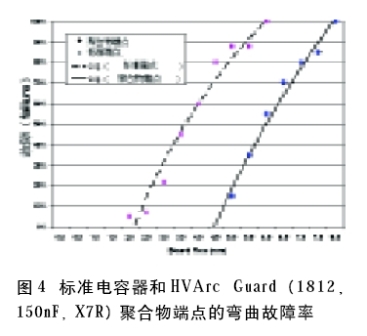 如同在前一部分中提到的那樣,焊接引線和涂層已廣泛用于生產(chǎn)高壓元件。除了引線外,引線框也可以用來封裝多個電容器,以得到更高的容量和增加符合性。盡管增加一個鷗翼型引線框會顯著增加元件的成本,但是它可以避免電路板彎曲的發(fā)生。直到最近,都沒有有效的方法來增加表面貼裝器件端點的符合性,但這個歷史已經(jīng)一去不復(fù)返了。通過在環(huán)氧聚合物端點上加上銀,可以防止電路板彎曲時發(fā)生的故障,進而增加可靠性。這種選擇目前已用于我們的OMD-Cap范圍高壓系列設(shè)計以及HVArc Guard電容器。當(dāng)電路板彎曲時,標(biāo)準(zhǔn)電容器與相同HVArc Guard電容器的聚合物端點的測試顯示的故障率差異如圖4所示。