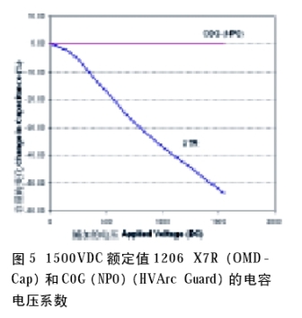 高壓電容器通常是采用X 7 R 和C0G 電解質(zhì)制造的。這些名稱描述了在-55~+125℃溫度系數(shù)將分別為美國電子工業(yè)協(xié)會(EIA)的±15%和±30×10-6/℃。C0G電容器也可以用更常用的術(shù)語表示,即NP0(正負(fù)零)。不過,值得注意的是,在1kHz條件下以1Vrms進行電容測量非常重要,各種材料可以用這些名稱來描述。對許多電源應(yīng)用來說,重要的是知道在某個具體電壓下的電容容量。X7R和C0G(NP0)電容器之間存在顯著的差異;施加了DC電壓的X7R電容器將釋放出大量容量,而C0G(NP0)電容仍然沒有太大的變化。出現(xiàn)這種現(xiàn)象是由于與C0G(NP0)電解質(zhì)的鐵電性質(zhì)相比,鐵電X 7 R 材料在剩余極化(remnant polarization)方面有根本的不同。實際上,雖然X7R MLCC具有高得多的容量,但是其容量在施加DC電壓時會顯著下降。這方面的一個例子如圖5所示。因此,當(dāng)采用多層電容器時,設(shè)計人員必須考慮到施加電壓下的可用容量。