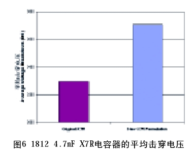 如前面敘述的那樣,有許多材料可以滿足X7R或C0G(NP0)的這類TCC要求。這些材料與各種設(shè)計的組合并不能在施加的DC電壓下以完全相同的方式實現(xiàn)。不同制造商任何給定電壓的可用容量一定會有很大的差異。較高的電壓可以與X 7 R 電解質(zhì)中的鐵電疇(ferroelectric domain)相耦合,在元件上產(chǎn)生一種機械應(yīng)力。這種“壓電應(yīng)力”會導(dǎo)致電容器在z方向上若干微米的移動。當(dāng)然,這是根據(jù)壓電執(zhí)行器的原理,但是在MLCC的情況下,連續(xù)的電壓尖峰會導(dǎo)致應(yīng)力裂紋和故障。為了解決這個問題,應(yīng)該使用這種具有降低壓電耦合能力的2000VDC 以上額定值的X7R電解質(zhì)電容器。降低耦合系數(shù)的影響可以增加擊穿耐壓,如圖6所示。這些設(shè)計采用了完全相同的有效厚度和“浮動電極”型設(shè)計。唯一的差異在于X7R電解質(zhì)的新制劑方面的修改,它可以減少與施加電壓的耦合。這種新制劑已用于我們的高壓OMD-Cap產(chǎn)品線。