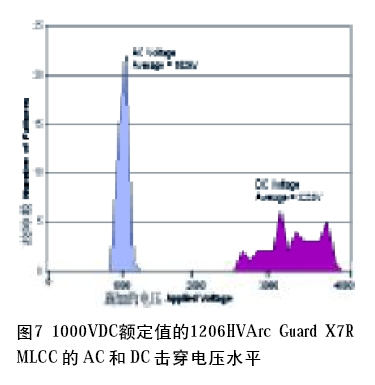 在許多應(yīng)用中,AC電源處理以及承受AC電壓的能力至關(guān)重要。測量這種能力的一種典型方法是在各種高頻條件下施加AC紋波電壓,直到電容器增加到超過環(huán)境溫度20℃以上。不過,在X7R電容器與C0G(NP0)的電容器之間又一次出現(xiàn)了顯著的差異,前者的剩余電偶(remnant dipole)隨著施加的電場移動而引起發(fā)熱,而后者在這種情況下的溫度不會增加。另一個AC 能力指標(biāo)是通過施加60Hz AC電壓,將其提升至6kV峰值30s 以上,直到發(fā)生電解質(zhì)擊穿而實現(xiàn)的。這種類型測試的結(jié)果可以與對1000VDC額定值的1206 X7R HVArc Guard電容器施加500Vdc/s的破壞測試的DC擊穿電壓相比,如圖7所示。D C 電壓故障的發(fā)生遠遠超過了1000VDC額定值。由于AC電壓故障發(fā)生在1000VAC左右,與DC電壓相比,故障的分布范圍很窄。