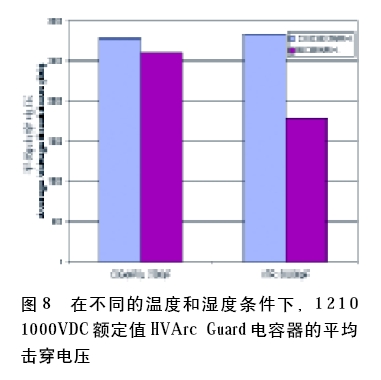 如前面提到的那樣,電容器或電路板涂層可以防止表面弧,而且還可以作為一種防潮的屏障。為了測試HVArc Guard元件對由濕度引起的故障的易感性,對1210外殼尺寸、1000VDC額定值的MLCC樣品進行了擊穿電壓測試,其環(huán)境條件為23.8℃/53.3%RH,提高的溫濕度為85℃/85%RH。其結(jié)果如圖8所示。盡管在85/85條件下X7R的平均擊穿電壓相當(dāng)?shù)停獵0G(NP0)幾乎不受影響。因此,C0G(NP0)看似不那么易受潮濕所引起故障的影響,而兩種情況的擊穿都是在容許范圍以內(nèi),即使是在高濕度條件下。兩種環(huán)境條件下測試的元件擊穿范圍均高于額定電壓。