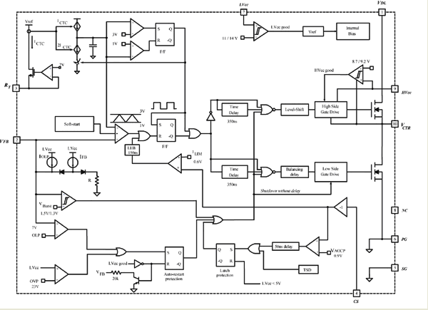 飛兆半導(dǎo)體的集成式“Green FPS”功率開關(guān)FSFA2100系列是專門針對不對稱半橋轉(zhuǎn)換器設(shè)計而開發(fā)的一種技術(shù)。這種技術(shù)在單個器件中整合了PWM控制器、高端驅(qū)動和SuperFET,只需要極少數(shù)量的外部元件。圖3所示為其內(nèi)部模塊示意圖。在大功率轉(zhuǎn)換器應(yīng)用中,PCB版圖設(shè)計一向是棘手部分,因?yàn)樵诓季謺r,為了把噪聲干擾降至最低,必需讓柵極驅(qū)動器和控制電路盡可能地靠近MOSFET。FSFA2100把柵極驅(qū)動器及控制電路與MOSFET集成在一起,使這些器件之間的距離最小化,從而大幅減小了終端應(yīng)用的噪聲干擾。此外,這樣做也減少了寶貴的設(shè)計時間,使生產(chǎn)力得以提高。