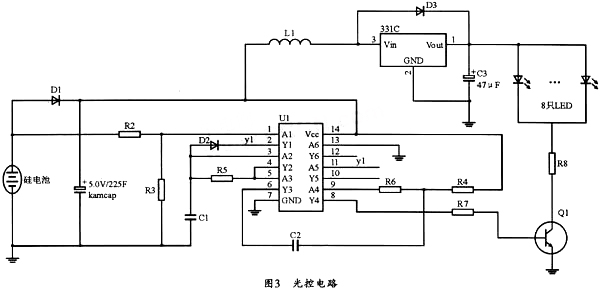 圖3中,U1為帶施密特觸發(fā)器的六反相器74HC14,其中的多諧振蕩器由第二個反相器與R5和C1構成。這樣,在白天光線變亮時,太陽能電池電壓升高,74HC14的1腳為高電平,74HC14的2腳為低電平,8腳同樣輸出低電平,三極管Q1截至,LED關斷。而當光線變暗時,太陽能電池電壓降低到一定程度時,HC14的1腳為低電平,HC14的2腳為高電平,多諧振蕩器開始振蕩,并經(jīng)過Y4輸出高、低電平,Q2時而導通時而截至,此時只要調節(jié)R6和C1的值,以把閃光頻率調節(jié)到人眼不能分辨即可,這樣做的最大好處是可以延長草坪燈工作時間。經(jīng)實際測試,該電路可以每天連續(xù)工作10小時以上,完全可以達到用戶的使用需求。