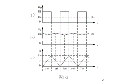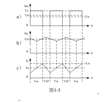 (3)當Ui < 2Uo時,即:濾波輸出電壓Uo大于電源輸入電壓Ui的一半時,或控制開關K的占空比大于二分之一時:在K接通期間,雖然流過儲能電感L的電流上升率(絕對值),小于,在K關斷期間,流過儲能電感L的電流上升率(絕對值)。但由于Ton大于Toff,(1-5)式中i(0)和(1-11)式中iLX均大于0,即:電感存儲能量每次均釋放不完。在這種情況下,流過儲能電感L的電流iL是連續(xù)電流,開關電源工作于連續(xù)電流狀態(tài),輸出電壓Uo的紋波比較小,且濾波輸出電壓Uo大于濾波輸入電壓uo的平均值Ua。參看圖1-5。