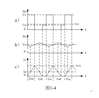 (2)當Ui > 2Uo時,即:濾波輸出電壓Uo小于電源輸入電壓Ui的一半時,或控制開關K的占空比小于二分之一時:雖然在K接通期間,流過儲能電感L的電流上升率(絕對值),大于,在K關斷期間,流過儲能電感L的電流上升率(絕對值);但由于(1-5)式中i(0)等于0,以及Ton小于Toff,此時,(1-11)式中的iLX會出現(xiàn)負值,即輸出電壓反過來要對電感充電,但由于整流二極管D的存在,這是不可能的,這表示流過儲能電感L的電流提前過0,即有斷流。在這種情況下,流過儲能電感L的電流iL不是連續(xù)電流,開關電源工作于電流不連續(xù)狀態(tài),因此,輸出電壓Uo的紋波比較大,且濾波輸出電壓Uo小于濾波輸入電壓uo的平均值Ua。參看圖1-4。