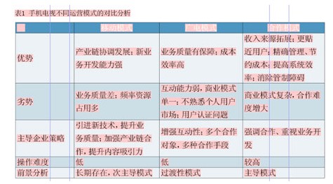 在手機電視運營模式上,應以合作模式為主導模式,以移動模式為次主導模式,不同運營模式的對比分析見表1。