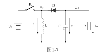 圖1-7中,Ui為輸入電源,K為控制開關,L為儲能電感,D為整流二極管,C為儲能濾波電容,R為負載電阻。當控制開關K接通的時候,輸入電源Ui開始對儲能電感L加電,流過儲能電感L的電流開始增加,同時電流在儲能電感中也要產生磁場;當控制開關K由接通轉為關斷的時候,儲能電感會產生反電動勢,使電流繼續(xù)流動,并通過整流二極管D進行整流,再經電容儲能濾波,然后向負載R提供電流輸出。控制開關K不斷地反復接通和關斷過程,在負載R上就可以得到一個負極性的電壓輸出。