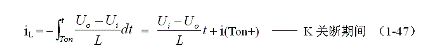 (1-44)式中iL為流過儲能電感L電流的瞬時值,t為時間變量;i(0)為的初始電流,即:控制開關K接通瞬間之前,流過儲能電感L中的電流。當開關電源工作于臨界連續電流狀態時,i(0) = 0 ,由此可以求得流過儲能電感L的最大電流為: