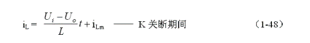 式中i(Ton+)為控制開關K從Ton轉換到Toff的瞬間之前流過電感的電流,i(Ton+)也可以寫為i(Toff-),即:控制開關K關斷或接通瞬間,之前和之后流過電感L的電流相等。實際上(1-47)式中的i(Ton+)就是(1-45)式中的iLm,因此,(1-9)式可以改寫為: