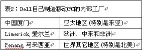 在后端,Dell采用復雜的按客戶訂單進行配置(CTO)的營運模式來支持這種產品定制。對移動PC,Dell有三個內部制造工廠來支持它所服務的主要終端市場。表2所示為Dell自己制造移動PC的內部工廠。