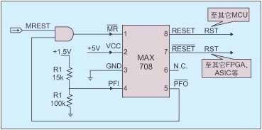 在電路設(shè)計(jì)中,MCU單元一般由51單片機(jī)構(gòu)成,單片機(jī)的復(fù)位信號(hào)是高有效。一般FPGA和ASIC的復(fù)位信號(hào)都是低有效。由于MAX708可同時(shí)輸出高電平有效和低電平有效的復(fù)位信號(hào),因此可以利用MAX708的這個(gè)特點(diǎn)來(lái)解決電路內(nèi)MCU、FPGA、ASIC的上電復(fù)位問(wèn)題。