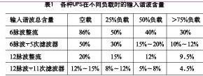 為了提高輸入指標,還可以采用12脈波整流器和輸入濾波器。但這些將增加尺寸、重量和成本,并降低整體效率。在滿載時輸入指標可以達到THD<5%,PF>0.95,但在半載或更低負載時輸入指標將嚴重惡化。各種UPS在不同負載時的輸入諧波含量如表1所示。