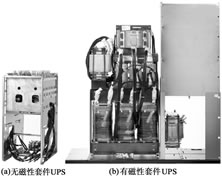 無變壓器UPS可以取消的元件,如圖7所示,稱為傳統UPS的“磁性套件”。它包括輸出變壓器、輸入電感、DC母線電抗器、輸出濾波器電感和輸入諧波濾波器電感。它們不但十分沉重,而且體積巨大,和旁邊的無變壓器UPS的部件相比差別十分明顯。
