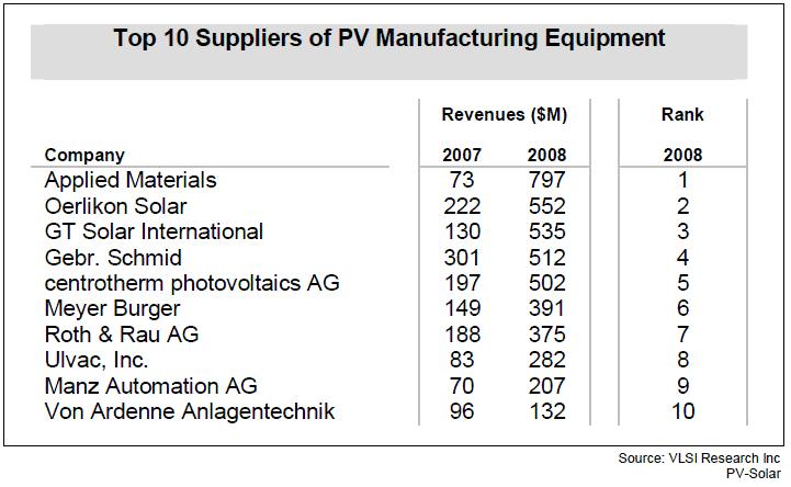 VLSI Research的數據顯示,Applied Materials全年晶體硅太陽能設備和薄膜太陽能設備收入總和達到了7.97億美元,超過了排在第二位的Oerlikon Solar,該公司收入額為5.52億美元。