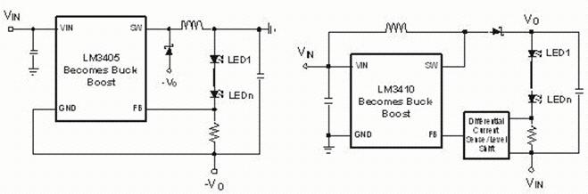 單電感Buck-boost可以像Buck或Boost調(diào)節(jié)器一樣組建,使它在系統(tǒng)成本的角度來講很吸引人。這種拓?fù)涞囊粋€(gè)缺點(diǎn)是Vo被反置(圖2a)或者以VIN為參照(圖2b)。測平移動或者反偏電路必須要用一些轉(zhuǎn)換器。像boost轉(zhuǎn)換器,它們有一個(gè)不連續(xù)輸出電流,并且需要一個(gè)輸出電容來維持一個(gè)持續(xù)LED電流。功率MOSFET要承受一個(gè)峰值為IIN加上IF的電流還有一個(gè)峰值為VIN加上VO的電壓。