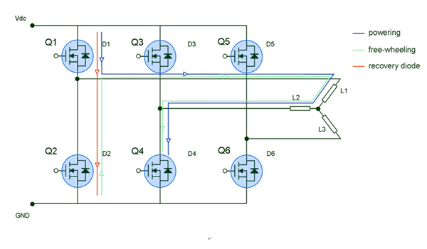 步驟1)功率級(jí)同時(shí)給兩個(gè)相位供電,而對(duì)第三個(gè)相位未供電。假設(shè)供電相位為L(zhǎng)1、L2,L3未供電。在這種情況下,MOSFETQ1和Q2處于導(dǎo)通狀態(tài),電流流經(jīng)Q1、L1、L2和Q4。