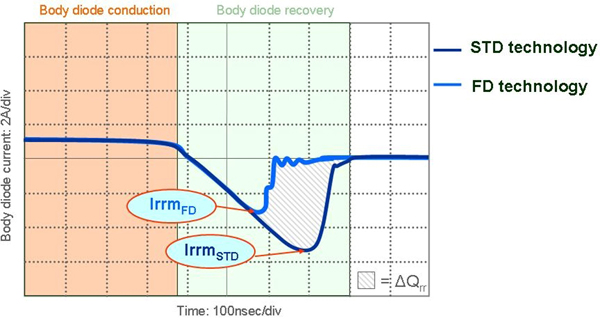 為改善在這些特殊應(yīng)用中體二極管的性能,研發(fā)人員開發(fā)出具有快速體二極管恢復(fù)特性MOSFET。當(dāng)二極管導(dǎo)通后被反向偏置,反向恢復(fù)峰值電流Irrm較小,完成恢復(fù)所需要的時(shí)間更短(見(jiàn)圖3)。