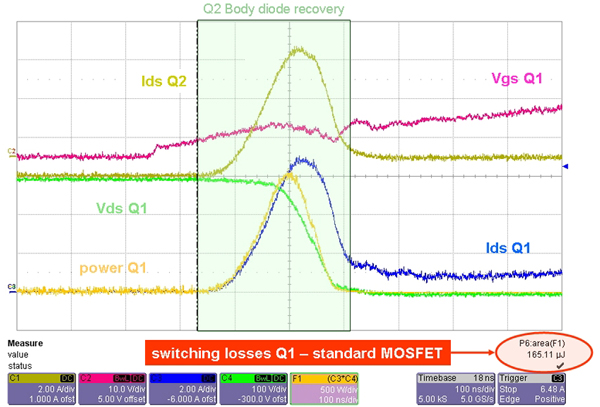 我們對(duì)比測(cè)試了標(biāo)準(zhǔn)的MOSFET和快恢復(fù)MOSFET。ST推出的STD5NK52ZD(SuperFREDmesh系列)放在Q2(LF)中,如圖4b所示。在Q1MOSFET(HF)的導(dǎo)通工作期間,開關(guān)損耗降低了65%。采用STD5NK52ZD時(shí)效率和熱性能獲得很大提升(在不采用散熱器的自由流動(dòng)空氣環(huán)境下,殼溫從60°C降低到50°C)。在這種拓?fù)渲校琈OSFET內(nèi)部的體二極管用作續(xù)流二極管,采用具有快速體二極管恢復(fù)特性MOSFET更為合適。