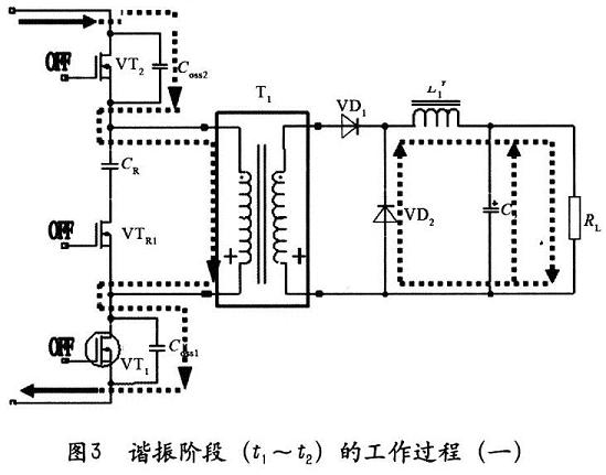 2)諧振階段(t1~t2),如圖3所示,在占空比的控制下,第一主開關(guān)管VT1和第二主開關(guān)管VT2在t1時(shí)刻同時(shí)關(guān)斷,變壓器磁芯極性反轉(zhuǎn)。因輸入電源和變壓器的勵磁電感的作用給VT1和VT2的寄生電容COSS1,COSS2充電,由于電容電壓不能突變,第一主開關(guān)管VT1和第二主開關(guān)管VT2在ZVS狀態(tài)下關(guān)斷。同時(shí)變壓器的勵磁電流開始給鉗位開關(guān)管VTR1的寄生電容COSS放電,經(jīng)VTR1的體二極管給鉗位電容CR1充電。次級VD1截止,VD2導(dǎo)通,L1經(jīng)過VD2續(xù)流繼續(xù)給負(fù)載RL供電。