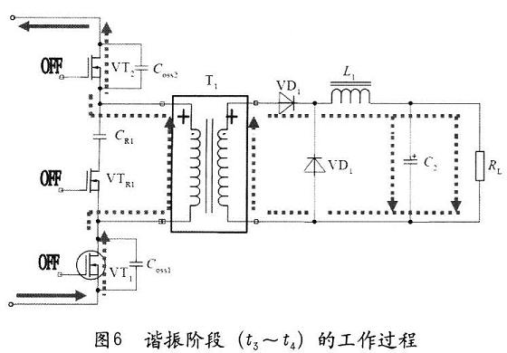 其中t1~t2和t3~t4的諧振時(shí)間是實(shí)現(xiàn)零電壓開關(guān)的關(guān)健,可以調(diào)節(jié)使零電壓開關(guān)做到最佳。