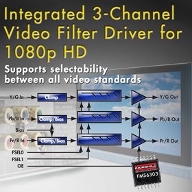 濾波器產(chǎn)品FMS6303,率先支持新興的1080p高清(HD)標(biāo)準(zhǔn),適用于高清液晶電視、藍(lán)光DVD播放器和機(jī)頂盒。 FMS6303視頻濾波器提供了從標(biāo)清到1080p 高清的選擇能力,為視頻應(yīng)用的設(shè)計人員提供了比現(xiàn)有集成式視頻濾波器更大的靈活性。該器件支持三個通道,并可選擇8MHz、16MHz、32MHz和65MHz頻率,適合全部視頻標(biāo)準(zhǔn)范圍。此外,F(xiàn)MS6303提供了穩(wěn)健的8kV ESD保護(hù)功能,能夠保護(hù)設(shè)備避免因靜態(tài)放電而導(dǎo)致?lián)p壞,并可省去分立保護(hù)器件。相比分立式解決方案,F(xiàn)MS6303可讓輸入和輸出進(jìn)行AC或DC耦合,能夠減少多達(dá)6個組件,節(jié)省約10%的電路板空間。