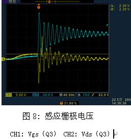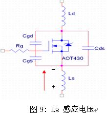 感應柵極電壓如圖8中的CH1所示,其值已達到2.3V。另外,由于源極引線電感的存在,在Q3內的電流迅速減小時,會在Ls的兩端感應出一個極性為上負下正的電壓,如圖9所示,此時加在DIE上的電壓Vgs(die)要大于在外部引腳上測量的Vgs電壓,所以由于Ls的影響,使得MOSFET有提前導通的可能。如果下管由于感應電壓而導通,則會造成上下管穿通,如果MOSFET不能承受此穿通電流,MOSFET就會損壞。