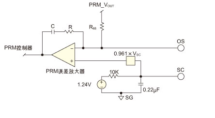 SC電壓經緩沖后通過電阻分壓器反饋給誤差放大器,其中電阻分壓器被表示為0.961的增益塊。R68形成了電壓檢測電阻分壓器的上半部分。這個電阻對每個PRM來說都是固定的。分壓器的下半部分是通過在OS引腳和SG(ROS)之間增加一個電阻形成的。公式1將PRM輸出定義為VSC和ROS的函數。從公式1可以看出,對于給定的ROS電阻,調整SC電壓可以確定PRM輸出電壓。這就是外部電流控制電路控制輸出所采用的方法。
