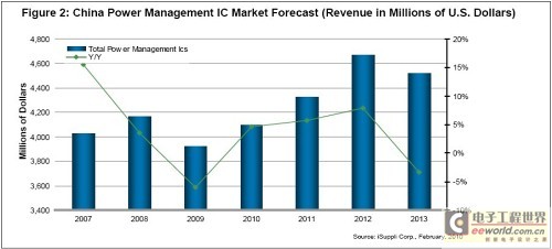 據(jù)iSuppli公司,繼2009年經(jīng)濟(jì)成長放緩之后,預(yù)計未來幾年中國電源管理IC(PMIC)市場將強(qiáng)勁擴(kuò)張,吸引更多的國內(nèi)企業(yè)加入。