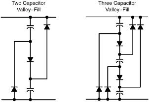業(yè)界有關(guān)無源(Passive)功率因數(shù)校正(PFC)的方案眾多,這些方案通常都使用較多的額外元器件,其中的一種方案就是谷底填谷(valley-fill)整流器,其中采用的電解電容和二極管組合增大了線路頻率導(dǎo)通角,從而改善功率因數(shù)。實際上,這個過程利用高線路電壓以低電流給串聯(lián)電容充電,然后在較低電壓時以較大電流讓電容放電給開關(guān)穩(wěn)壓器。典型應(yīng)用使用2個電容和3個二極管,而要進(jìn)一步增強(qiáng)功率因數(shù)性能,則使用3顆電容和6個二極管。