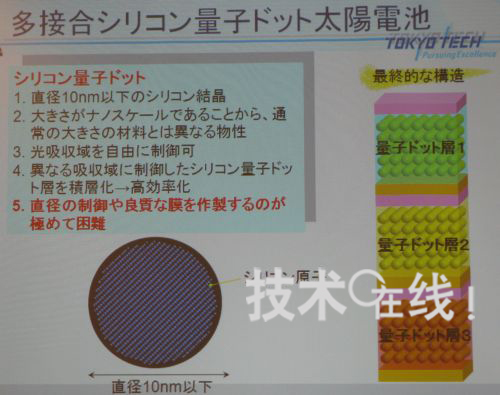 東京工業大學教授小長井誠研究小組,大幅提高了利用硅量子點的太陽能電池的開放電壓(Voc)及I-V特性形狀因子(FF)數值。2010年3月10日,該消息是在應用物理學會舉行的2010年春季應用物理學會學術演講會的會前新聞發布會上宣布的。