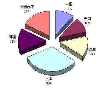 如果以地區(qū)別來(lái)觀察,日本全球的產(chǎn)值仍居冠,臺(tái)灣廠商以市占率17%排名第二。而韓國(guó)的市占率由2008年的9%竄升到2009年的15%,位居全球第3。