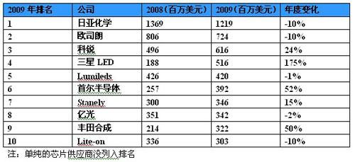 以個(gè)別廠商營(yíng)收觀察,較早切入大尺寸背光市場(chǎng)的LED供應(yīng)商,營(yíng)收都在金融 海嘯中逆勢(shì)成長(zhǎng),例如韓國(guó)SamsungLED、首爾半導(dǎo)體 、日本廠商豐田合成等廠商。在營(yíng)收排名上,2009年日亞化仍居全球第1名。其次是OSRAMOpto.與CREE等傳統(tǒng)LED大廠,臺(tái)灣廠商光寶、億光也都入榜前10名。