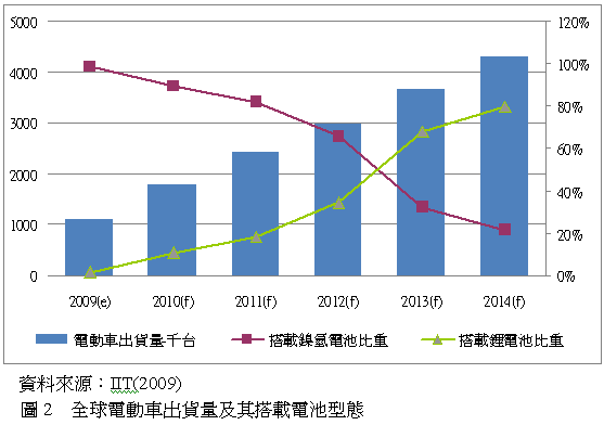 2009年全球汽車出的出貨量約為6300萬臺,當(dāng)中電動車出貨量約為110萬臺,目前電動車市場份額小,而且以鎳氫電池為主,不過在鋰電池持續(xù)的發(fā)展下相當(dāng)有機(jī)會在2013年就取代鎳氫電池成為電動車用電池的主要電池型態(tài)。依照IIT在2009年的預(yù)估,全球的電動車用電池型態(tài)在2012年就會有很明顯 的改變,到2012年鎳氫電池約佔(zhàn)全球電動車比重的六成五、鋰電池佔(zhàn)三成五,到2013年就會出現(xiàn)黃金交叉點(diǎn),鋰電池佔(zhàn)全球電動車比重的六成八、鎳氫電池 佔(zhàn)三成二,顯示隨著時間的經(jīng)過鋰電池的安全性以及電容量得到實(shí)證的支持,會讓鋰電池的飛輪在未來快速起飛,如圖2。