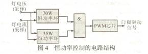 由圖3可知,全橋逆變電路的總體負(fù)載只有燈消耗有功功率,因此燈消耗的功率可近似看作是逆變器的輸入功率。所以通過不斷采樣燈回路上的輸出電壓Uo和輸出電流Io,采用拋物線近似的恒功率控制方法,用模擬電路來實現(xiàn)可使控制精度達到±5%左右的恒功率控制。但是,汽車頭燈比較特殊,為了要滿足其在4s內(nèi)達到額定光輸出的80%這一特殊要求,一開始提供70W的瞬態(tài)功率給燈,而汽車頭燈的額定功率為35W。所以,在設(shè)計時需要兩個恒功率控制環(huán),兩者的切換通過一個門電路來實現(xiàn),圖4示出恒功率控制的電路結(jié)構(gòu)