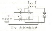 點火方式采用脈沖式點火,電路采用倍壓整流電路。圖5示出點火控制電路。全橋逆變器輸出的正向電壓先把VD2導(dǎo)通,給電容C2充電;輸出的負(fù)電壓把VD1導(dǎo)通,給C1充電。當(dāng)每個電容都充電到400V時,可使800V的氣體放電管觸發(fā)導(dǎo)通,開始放電。這樣,當(dāng)變壓器初級產(chǎn)生800V脈沖時,次級就會產(chǎn)生上萬伏的高壓脈沖,從而將高強度的氣體放電管雪崩擊穿。