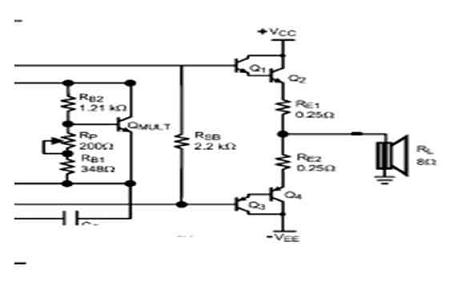 射極電阻器RE:在高功率的音訊放大器應用中,輸出晶體管的匹配性、電流平衡和保護對于功率放大器的線性度來說非常重要。建議采用射極負反饋電阻器RE來改善輸出晶體管的匹配性和電流平衡能力。因此,我們建議在實際的高功率音訊放大器應用中加入這種電阻。然而,將RE與輸出晶體管串聯在一起會降低放大器的線性度。電阻RE是交越失真的主要失真來源。當輸出晶體管的一端關閉而另一端開啟時便會出現這種失真。因此,必須最佳化RE值并且盡可能的將RE維持在較低水平,這樣可以降低對非線性度的影響。