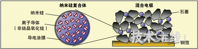 該公司的硅類負極材料的特點是,含有將粒徑僅為nm大小的硅分散于非結晶SiO(氧化硅)內的“納米硅復合體”(圖1)。而非結晶SiO可緩和硅的膨脹及縮小程度。實際上是利用碳覆蓋SiO的粒子表面,以提高導電性,然后與原來的負極材料——石墨混合起來利用。