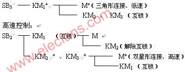 按下任何一個速度起動控制按鈕(SB1、SB2、SB3),對應的接觸器線圈得電,其自鎖和互鎖觸點動作,完成對本線圈的自鎖和對另外接觸器線圈的互鎖,主電路對應的主觸點閉合,實現對電動機定子繞組對應的接法,使電動機工作在選定的轉速下。