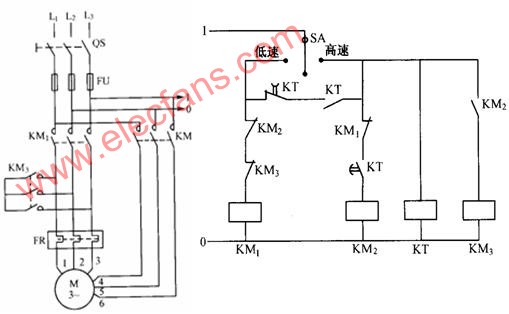 轉換開關SA置于高速位置,KT得電,其瞬時觸點閉合,KM1得電,M低速運行,當時間繼電器的設定時間到達,KM1失電,KM2、KM3得電,電動機M高速運行。